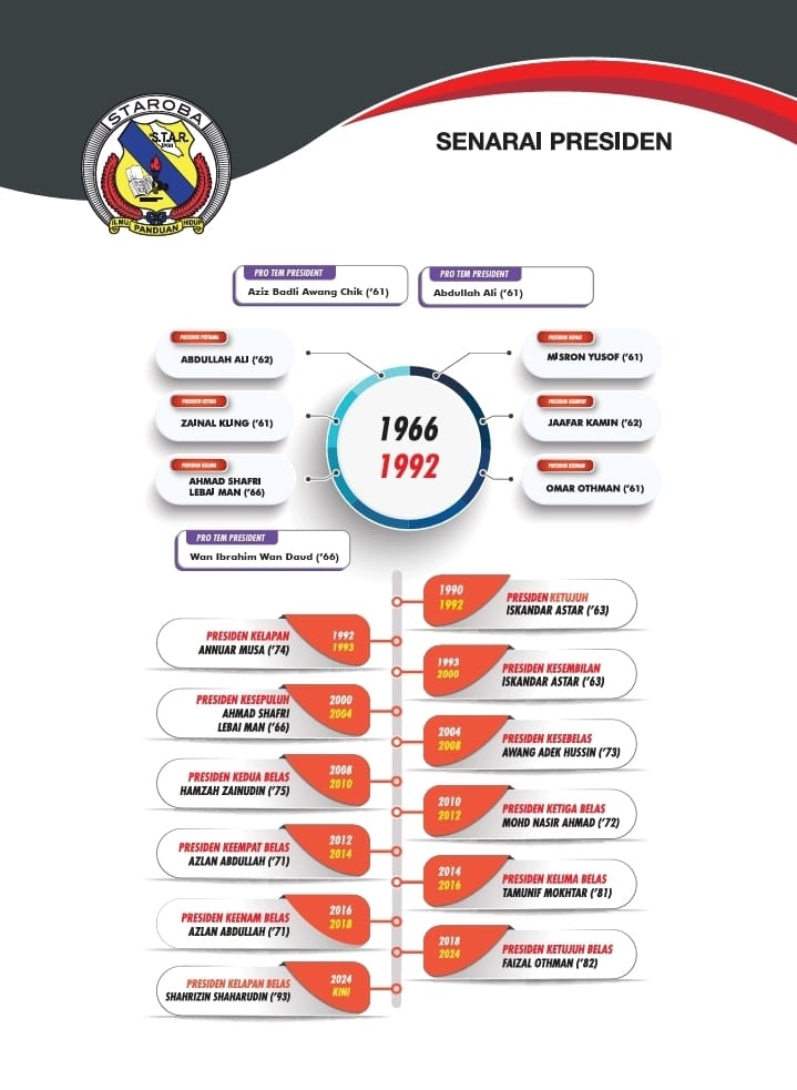 Persatuan Bekas Penuntut Sekolah Tuanku Abdul Rahman, Ipoh or STAROBA is a registered society with Registry of Societies of Malaysia. Staroba was registered in 1961 with its main aim as an avenue for alumni of STAR, Ipoh to gather and re-connect to create supporting and cooperative environment for its members.